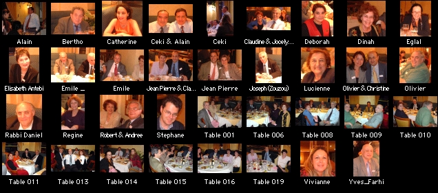 For many years, the idea of an international meeting of the Farhi has been discussed among many of us but the herculean task of organising one discouraged many of us and nothing materialised. In April 2002, Ceki , on a business trip, visited me in Taipei and suggested that a smaller regional reunion in Paris might be of interest and easily done. He suggested that he could organise one dinner if I ever made a trip to France. Since I was planning a European trip the following month, we set the date for May 13, 2002. A month later, after many emails, calls and letters by Ceki , Robert, and Claudine Fellous and yours truly, the dinner was held without pomp or ceremony in Paris au Génie D'or near la Bastille, a restaurant managed by Adel of Egypt. About 7 pm, 40 guests (Farhi and spouses and friends) met for dinner. The menu and wine were French. At the same time, several Farhi from Istanbul who could not make the trip, held a similar dinner and a telephone link was established. Adriana Dinar of Barcelona organised the latter one. We were honored to have the presence of Chief Rabbi Daniel Farhi and his family among us. After the cocktails, introduction and short speeches about the reunion, the Genealogy of the Farhi, we sat for a dinner that went well past midnight. Each guest spoke briefly about themselves, their ancestry and current family. We all felt part of one big family. The Farhi were mainly French residents but their ancestors or themselves came from Bulgaria, Tunisia, Turkey, Lebanon, Syria and Egypt. Several knew each other before the dinner and were all eager to meet again for another dinner or event before year end. Here are some photos taken during the evening. Contact Sheet with NamesLow Resolution (36K) |