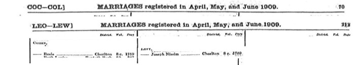 Joseph Nissim Levy and Rosie Cohen Marriage Index 1909