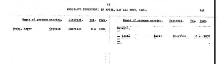 Mayer Barki and Linda Crispin Marriage 1921-04-14 Index