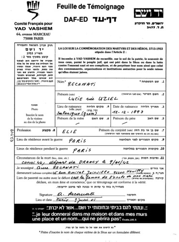 Aure Recanati Yad Vashem testimony of Lucie (née Uziel) Recanati wife her husband’s uncle 2001-06-09